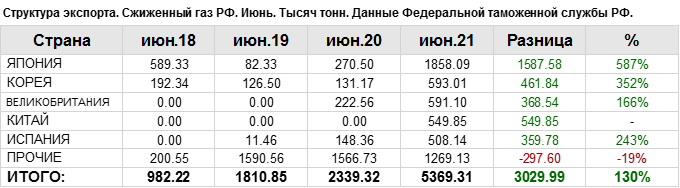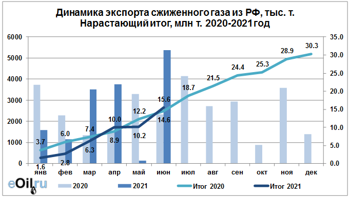 Росстат. Экспорт сжиженного газа из России на июнь 2021