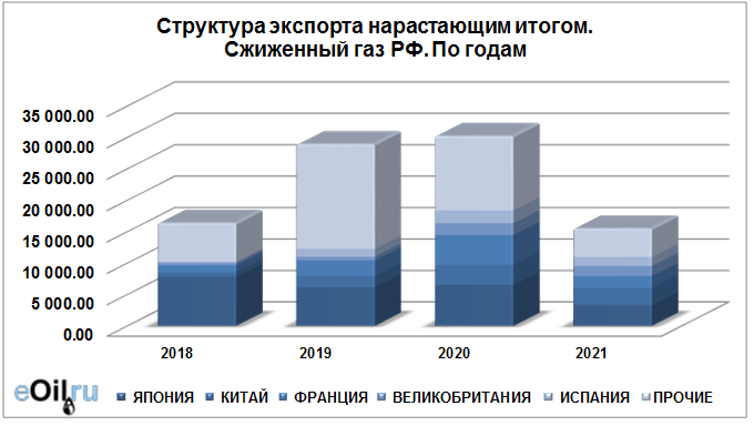 Структура экспорта сжиженного газа из России нарастающим итогом по годам