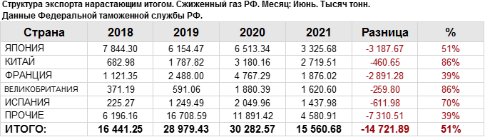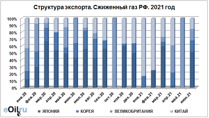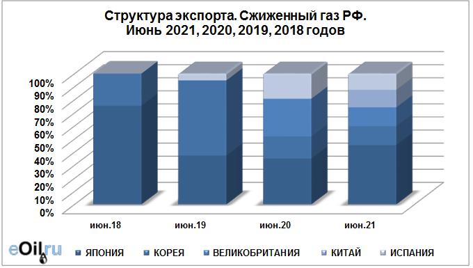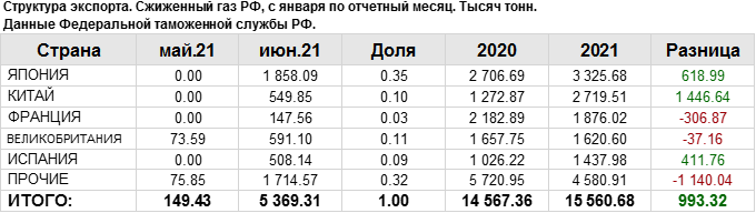 Структура экспорта сжиженного газа из России с января 2021 по июнь 2021