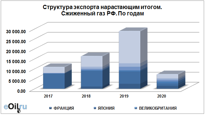 Структура экспорта сжиженного газа из России нарастающим итогом по годам