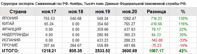 В ноябре 2020 года общий объем экспорта сжиженного газа составил: 3600.69 тыс. тонн.