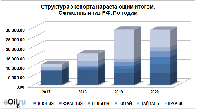 Структура экспорта сжиженного газа из России нарастающим итогом по годам