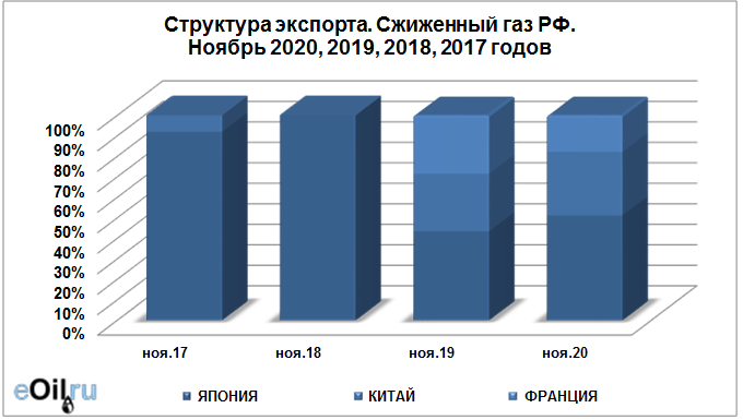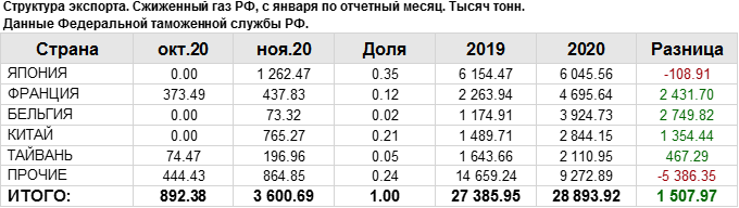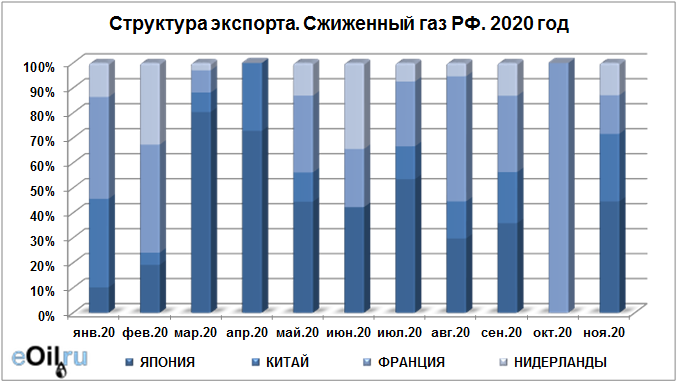Структура экспорта сжиженного газа из России с января 2020 по ноябрь 2020