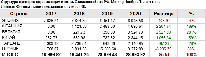 Росстат. Экспорт сжиженного газа из России на ноябрь 2020