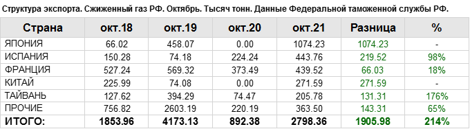 В октябре 2021 года общий объем экспорта сжиженного газа составил: 2798.36 тыс. тонн.