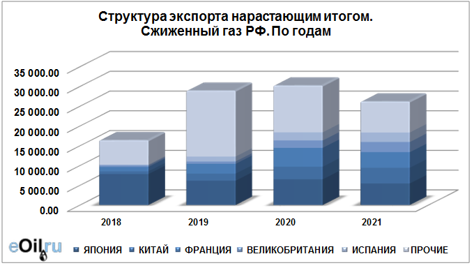 Структура экспорта сжиженного газа из России нарастающим итогом по годам