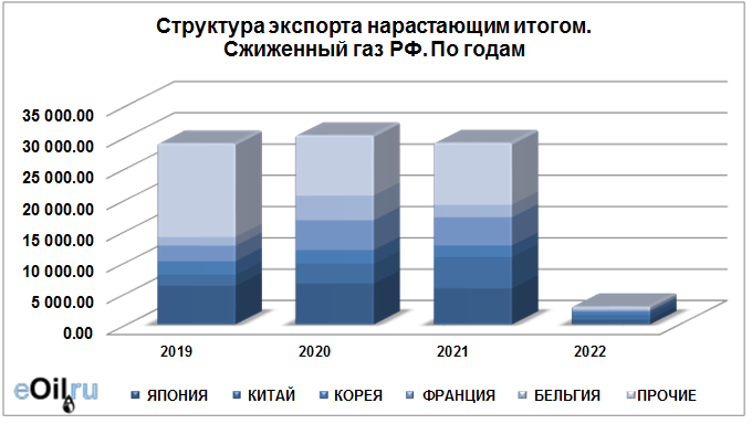 Структура экспорта сжиженного газа из России нарастающим итогом по годам