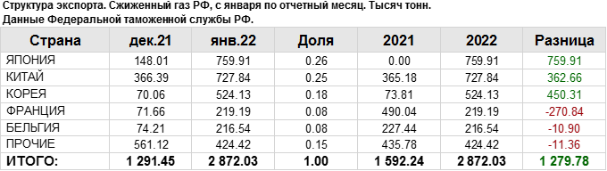 В январе 2022 года общий объем экспорта сжиженного газа составил: 2872.03 тыс. тонн.