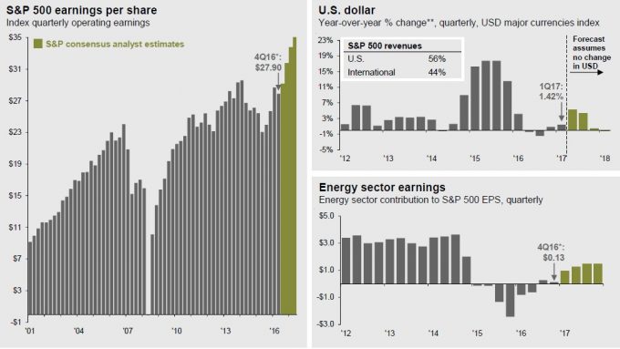 На рисунке 1 показатель прибыли на акцию (EPS) основан на показателях операционного дохода. Оценка прибыли является приблизительным прогнозом аналитиков компании Standard & Poor. Годовой показатель изменений исчислен на основании усредненных квартальных показателях. В прогнозе не учтено изменение курса американского доллара после 31 марта 2017 г.