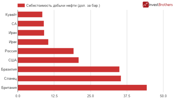 Самая низкая себестоимость добычи нефти у Кувейта и Саудовской Аравии. Стоимость безубыточной добычи “черного золота” в этих странах составляет 8,5 и 8,98 долларов за баррель соответственно. Следующими идут Иран и Ирак, где бочка нефти стоит 9,08 и 10,57 долларов. В России точка безубыточности находится на уровне в 19,21 долларов за баррель, в США примерно столько же – 20,99 долларов (не включая сланцевую нефть). Самая дорогая добыча в Великобритании и Бразилии, для этих стран себестоимость производства равна 44,33 и 34,99 долларов за бочку соответственно.