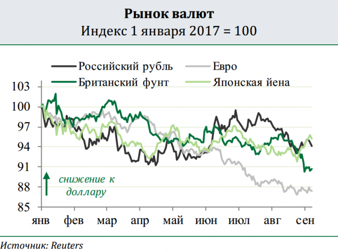 ФРС США оставила неизменной ставку (1-1,25%) и объявила о запуске с октября программы по сокращению активов на своём балансе. Решение регулятора было ожидаемо рынком и практически не оказало влияния на курсы валют. Курс евро 1,19-1,2. Рубль стабилен, средний курс за неделю – 58 руб./$ (57,6 руб./$ неделей ранее). Рубль к пятнице – 57,5 руб./$. Волатильность фондовых рынков на прошедшей неделе была низкой.