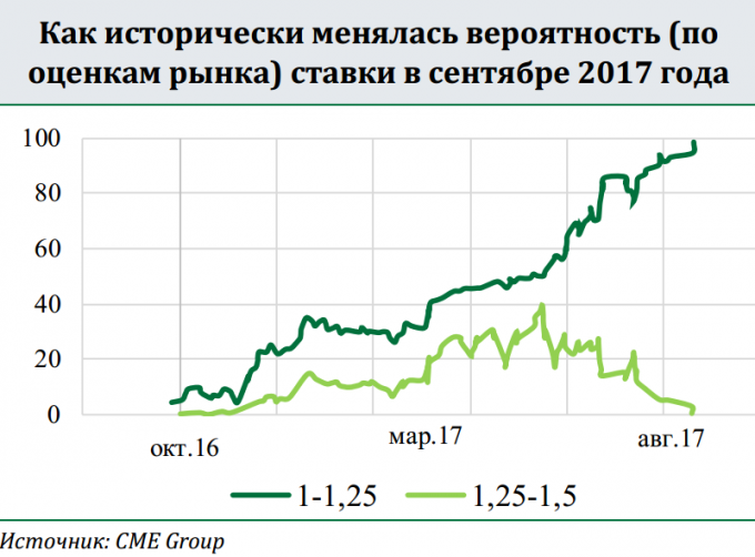 ФРС оставила диапазон ключевой ставки неизменным 1-1,25%, как от неё все и ожидали. Управление ожиданиями (forward guidance) в понимании ФРС предполагает длительное формирование ожиданий у рынка, а затем минимальное от них отклонение. Именно так и поступает ФРС последние годы, благо инерция инфляции велика и позволяет не торопиться. Сейчас ФРС видит восходящий инфляционный тренд (см. график 1), так что сомнений в повышении ставки нет. С вероятностью 27% это произойдёт 1 ноября, с вероятностью 71% — 13 декабря. Угадать же ставку через год с точностью 0,25пп сложно (см. график 2). Ураганы, по мнению ФРС, могут немного затормозить инфляцию, но в среднесрочной перспективе на неё не повлияют.