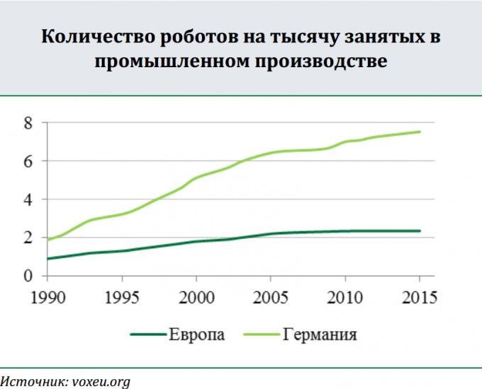 С 90-х годов количество промышленных роботов в ФРГ выросло более чем в 4 раза. Сегодня в среднем по стране насчитывается 7,6 машин на тысячу человек (в Европе – 2,7, в США – 1,6, а в России – менее 1). Но, несмотря на это, доля занятых в промышленности до сих пор остаётся очень высокой (25%). Ускоряющаяся роботизация практически не повлияла на общий уровень безработицы в ФРГ, и лишь на 1,3пп снизила долю занятых впромышленности. При этом сужение отрасли происходило не за счёт увольнения сотрудников, а благодаря созданию меньшего количества новых рабочих мест.