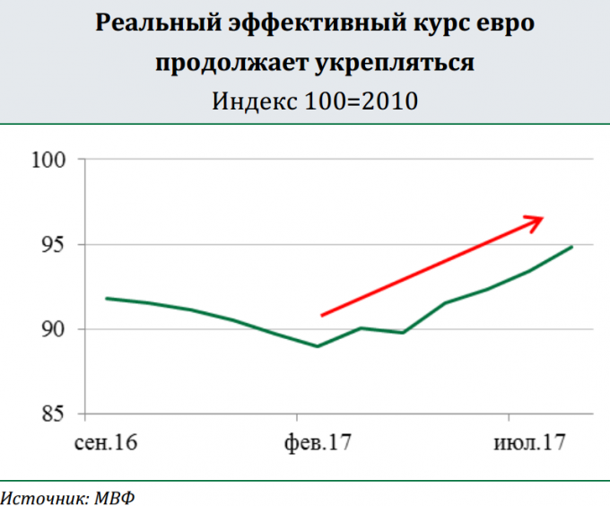 Реальный эффективный курс евро с апреля 2017 года укрепился на 6%. Этому способствовало улучшение перспектив экономического роста в ЕС и новости о возможном завершении QE. В среднем удорожание евро на 10% приводит к замедлению инфляции на 0,5пп. Таким образом, если данныйтренд сохранится, то ЕЦБ может повременить с завершением программы количественного смягчения.