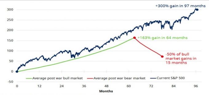 Инвесторы, которые уверенно ощущают себя на текущем бычьем рынке акций могут начать беспокоиться, увидев график на Рисунке 2. Команда Schroders Plc соотнесла показатели индекса S&P 500 и исследование Majedie Asset Management, которое показывает средние значения бычьих и медвежьих рынков. Согласно нижеприведенному графику, текущее бычье состояние рынка длится необычайно долго. Если судить по резкости предыдущих изменений тенденции, то при переходе от бычьей тенденции к медвежьей, трейдеры могут быть просто шокированы.
