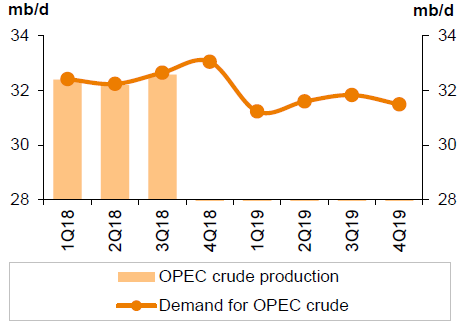 Прогноз по спросу на нефть, добываемую в странах ОПЕК, на 2019 год — сокращение на 1.1 млн. баррелей в день до 31.5 млн. баррелей в день. Это на 0.3 млн. баррелей в день меньше, чем указывалось в предшествующем отчете.