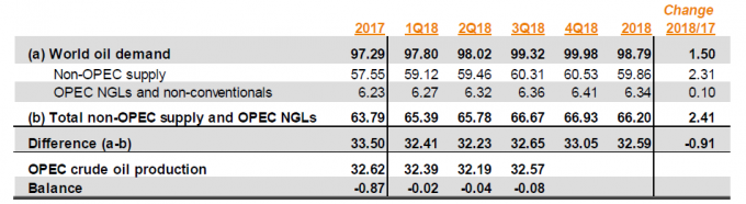 Показатель спроса на нефть, добываемую в 15 странах ОПЕК, в 2018 году был пересмотрен в сторону снижения на 0.1 млн. баррелей в день и составил 32.6 млн. баррелей в день, что на 0.9 млн. баррелей в день меньше, чем уровень 2017 года.