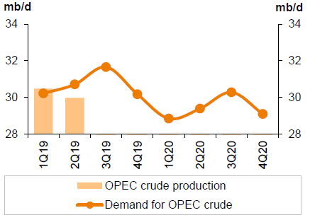 В сравнении с соответствующими четвертями 2018 года, спрос на нефть из стран ОПЕК в первом квартале 2019 года был на 1.8 млн. баррелей меньше, во втором квартале — на 1.1 млн. баррелей меньше, в третьем квартале — на 0.2 млн. баррелей в день меньше и в четвертом квартале — на 0.7 млн. баррелей в день меньше (прогноз).