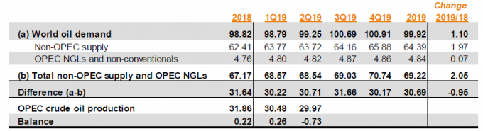 Показатель спроса на нефть, добываемую в странах ОПЕК, в 2019 году был пересмотрен в сторону увеличения на 0.1 млн. баррелей в день до 30.7 млн. баррелей в день. Это на 0.9 млн. баррелей в день меньше, чем в 2018 году.