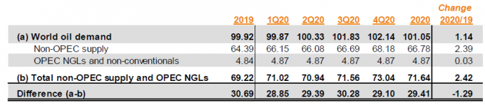 В сравнении с соответствующими четвертями 2019 года, спрос на нефть из стран ОПЕК в первом квартале 2020 года будет на 1.4 млн. баррелей в день меньше, во втором квартале — на 1.3 млн. баррелей в день меньше, в третьем квартале — на 1.4 млн. баррелей в день меньше и в четвертом квартале — на 1.1 млн. баррелей в день меньше.