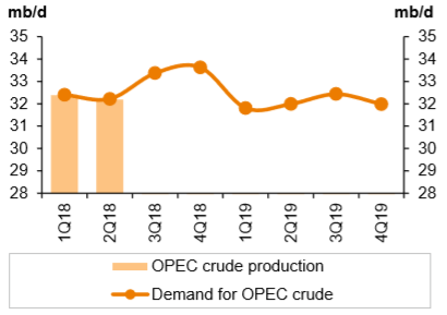 Согласно прогнозам, в 2019 году спрос на нефть, производимую в странах ОПЕК, снизится на 0.9 млн. баррелей в день и в среднем будет составлять 32.1 млн баррелей в день, что практически не отличается от предыдущего прогноза.