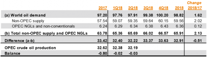 В сравнении с предыдущим отчетом, показатели спроса на нефть из стран ОПЕК в первом и четвертом кварталах 2018 года были пересмотрены в сторону повышения на 0.1 млн. баррелей в день и 0.2 млн. баррелей в день соответственно. В то время как показатель спроса во втором квартале текущего года был пересмотрен в сторону снижения на 0.1 млн. баррелей в день. Показатель спроса за третий квартал 2018 года остался неизменным по сравнению с указанным показателем в предыдущем отчете.