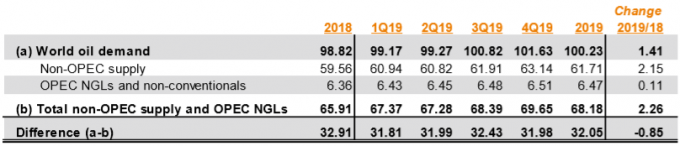 Прогноз спроса на нефть, добываемую в странах ОПЕК, в 2019 году остался практически неизменным и, согласно ему, показатель спроса составит 32.1 млн. баррелей в день, что на 0.9 млн. баррелей в день меньше, чем в 2018 году.