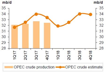 Соотношение спроса и предложения в 2017 году. Отчет ОПЕК февраль 2018.