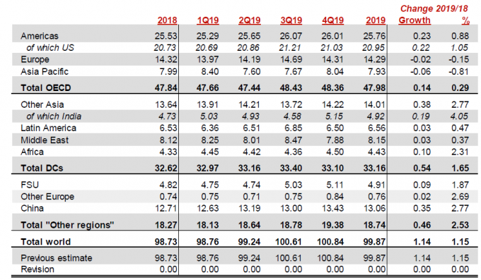 В регионах ОЭСР Europe и Asia-Pacific спрос на нефть сократится на 0.03 млн. баррелей в день и 0.07 млн. баррелей в день соответственно.
