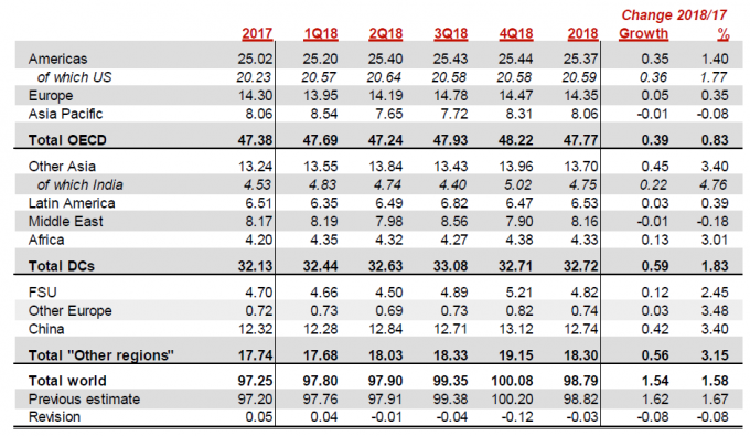 Общий уровень потребления на рынке нефти в 2018 году составит 98.79 млн. баррелей в день. Показатель спроса на нефть в странах ОЭСР был пересмотрен в сторону уменьшения на 30 тыс. баррелей в день. В регионе ОЭСР Europe показатель спроса на нефть был пересмотрен в сторону снижения на 20 тыс. баррелей в день.