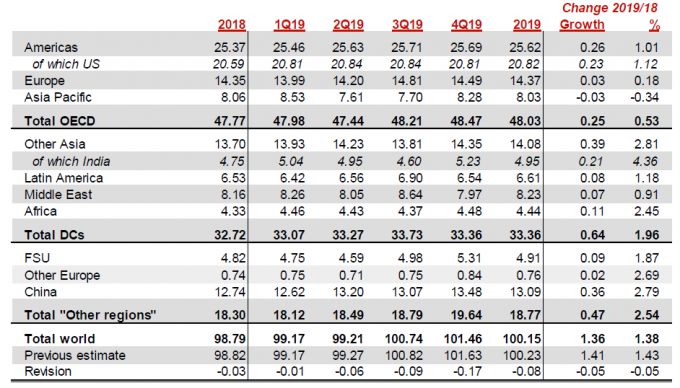 Ожидается, что спрос на нефть в мире в 2019 году возрастет на 1.36 млн. баррелей в день до 100.15 млн. баррелей в день. Это на 50 тыс. баррелей в день меньше, чем указывалось в предшествующем отчете.