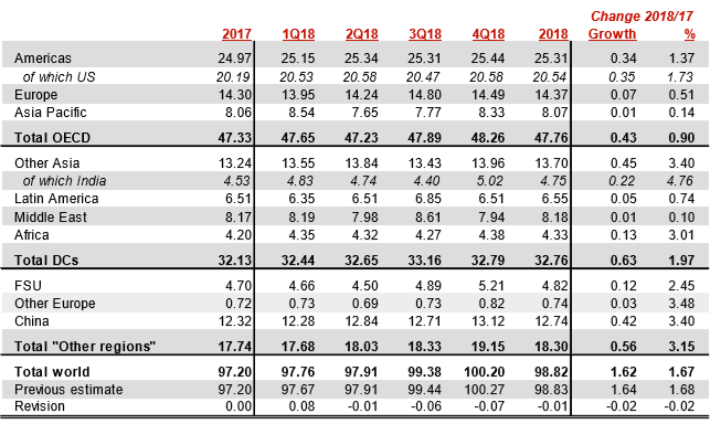 Согласно последним данным, в странах, не входящих в ОЭСР, показатель роста спроса на нефть в 2018 году был пересмотрен в сторону понижения на 20 тыс. баррелей в день, несмотря на положительные тенденции роста на 25 тыс. баррелей в день в Азии. В азиатских странах, не входящих в ОЭСР, спрос на нефть вырос, что, главным образом, отражает увеличившиеся темпы развития Индии, Индонезии, Малайзии, Таиланда и Сингапура.