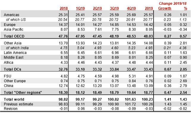Показатели роста в текущем году в Латинской Америке и на Ближнем Востоке были пересмотрены в сторону снижения на 30 тыс. баррелей в день и 13 тыс. баррелей в день, соответственно. Причиной спада послужило замедление экономического развития, отрицательно повлиявшего на рост спроса на нефть, в Латинской Америке, а также планы по экономической реструктуризации, предполагающей сокращение субсидий, на Ближнем Востоке.