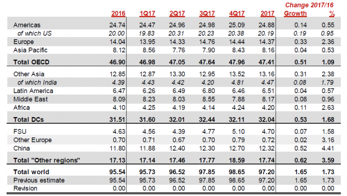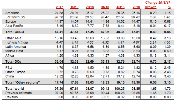 Прогноз роста спроса для стран ОЭСР в 2018 году был пересмотрен в сторону увеличения на 0.02 млн. баррелей в день. Для стран, не входящих в ОЭСР, прогноз был пересмотрен в сторону уменьшения.