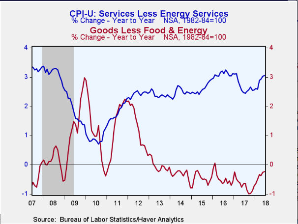 График 2. CPI для всех городских потребителей: все услуги (без учета энергоуслуг) и CPI без учета продуктов питания и энергоносителей. Процентное изменение год к году. Источник: Бюро статистики труда США/ Haver Analytics