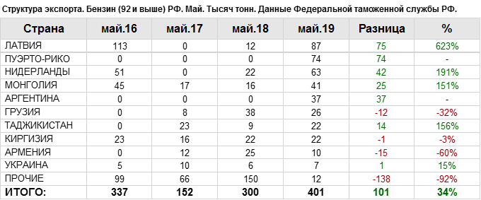 В мае 2019 года общий объем экспорта бензина (92 и выше) составил: 401.29 тыс. тонн.