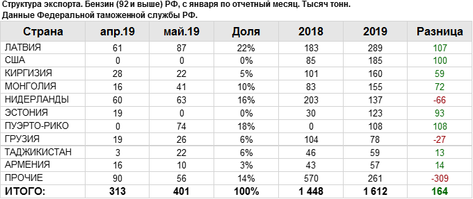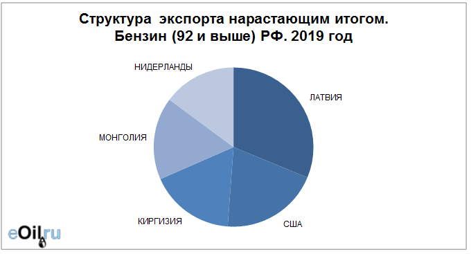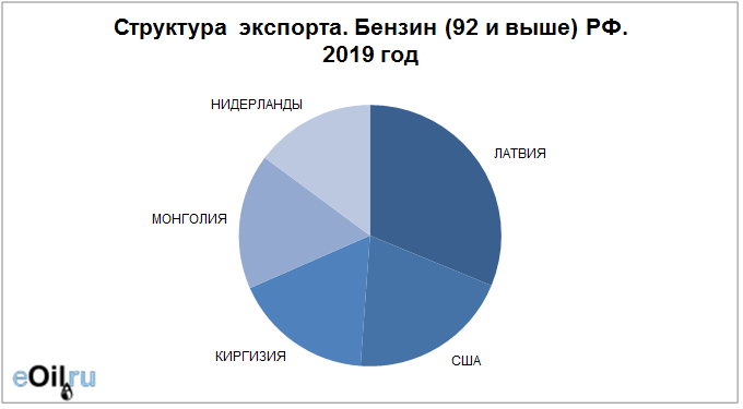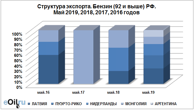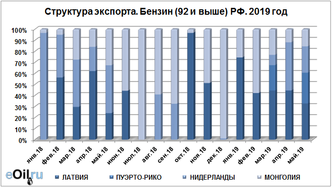 Структура экспорта бензина (92 и выше) из России. Данные на май 2019