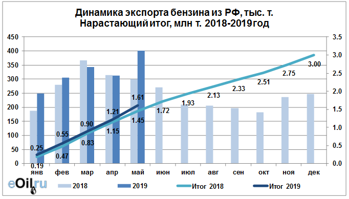 В 2019 году объем поставок бензина (92 и выше) на экспорт достиг 1611.68 тыс. тонн. Данный объем на текущий момент составляет 54% от объема прошлого 2018 года.