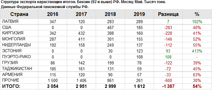 Объем поставок бензина (92 и выше) на экспорт за период с января 2019 года по май 2019 года в Киргизию составил 159.87 тыс. тонн, что на 58.7 тыс. тонн больше объема поставок в данную страну в 2018 году.