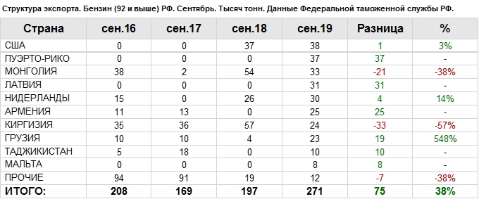 В сентябре 2019 года общий объем экспорта бензина (92 и выше) составил: 271.18 тыс. тонн.