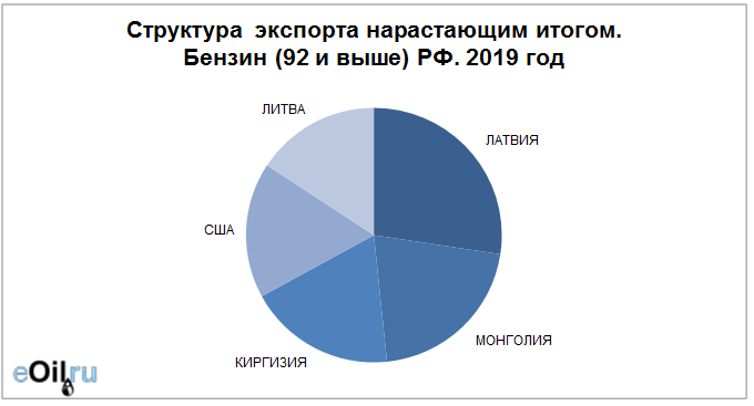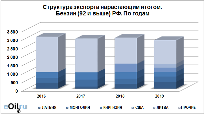 Структура экспорта бензина (92 и выше) из России нарастающим итогом по годам