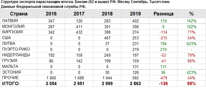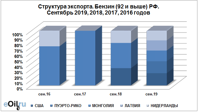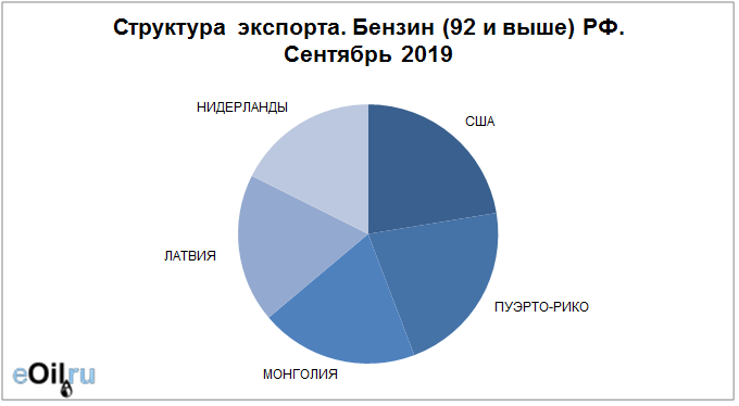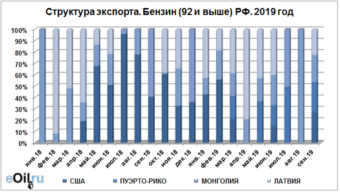 Структура экспорта бензина (92 и выше) из России с января 2019 по сентябрь 2019