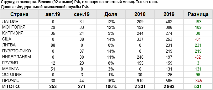 Объем поставок бензина (92 и выше) на экспорт за период с января 2019 года по сентябрь 2019 года в Латвию составил 401.91 тыс. тонн, что на 193.12 тыс. тонн больше объема поставок в данную страну в 2018 году.