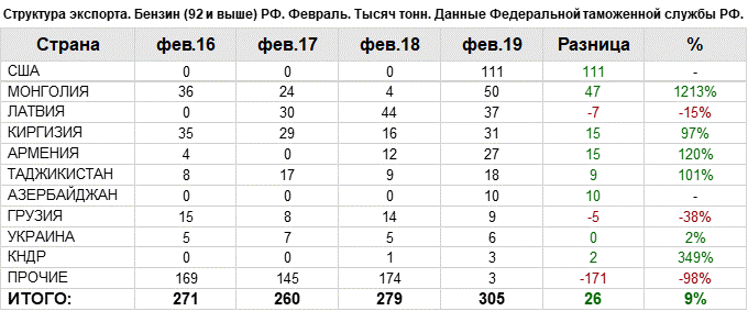 В феврале 2019 года общий объем экспорта бензина (92 и выше) составил: 305.5 тыс. тонн.