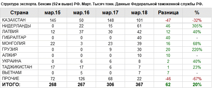 В марте 2018 года общий объем экспорта бензина (92 и выше) составил: 367.43 тыс. тонн.