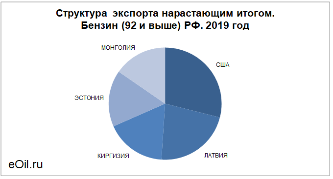 Структура экспорта бензина (92 и выше) из России нарастающим итогом по годам