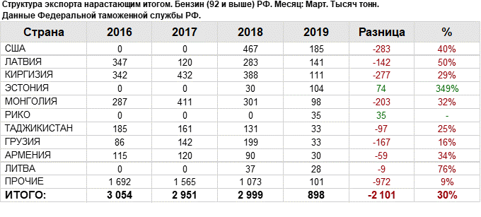 Структура экспорта бензина (92 и выше) из России с января 2019 по март 2019