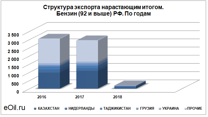 Структура экспорта бензина (92 и выше) из России нарастающим итогом по годам
