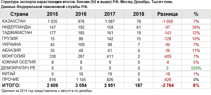 В 2018 году объем поставок бензина (92 и выше) на экспорт достиг 187.04 тыс. тонн. Данный объем на текущий момент составляет 6% от объема прошлого 2017 года.