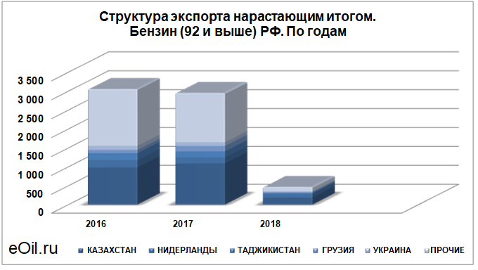 Структура экспорта бензина (92 и выше) из России нарастающим итогом по годам